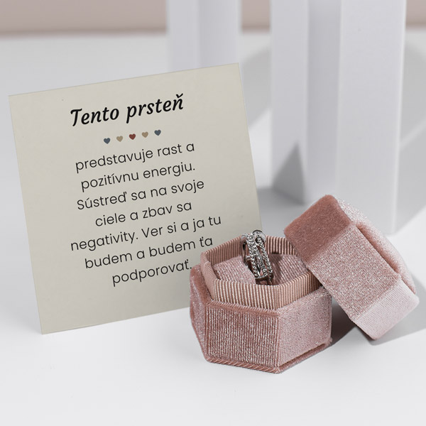 Tento prsteň predstavuje rast a pozitívnu energiu. Sústreď sa na svoje ciele a zbav sa negativity. Ver si a ja tu budem a budem ťa podporovať.