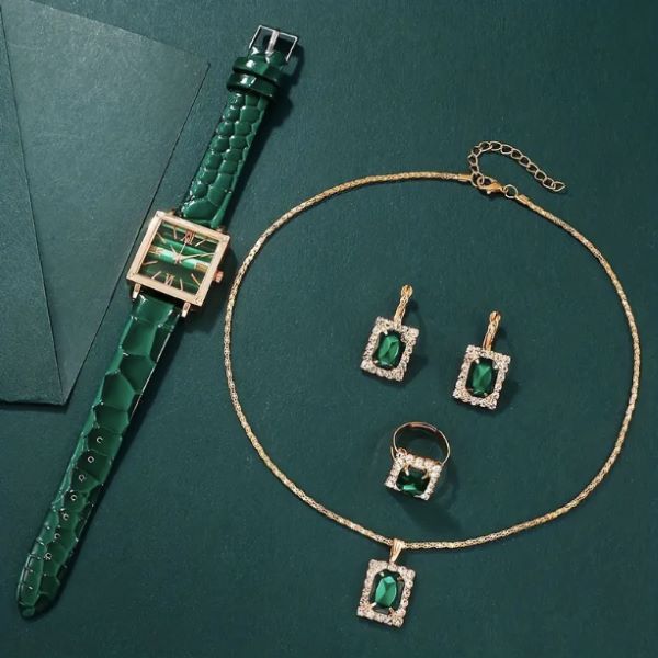 Táto elegantná sada obsahuje klasické quartzové hodinky so štvorcovým ciferníkom vo výrazných zelených odtieňoch, ktoré doplňuje oslnivá súprava šperkov s kamienkami, vďaka čomu môžete pozdvihnúť svoj vlastný štýl a podeliť sa o eleganciu so svojimi blízkymi. 🎁⌚💚